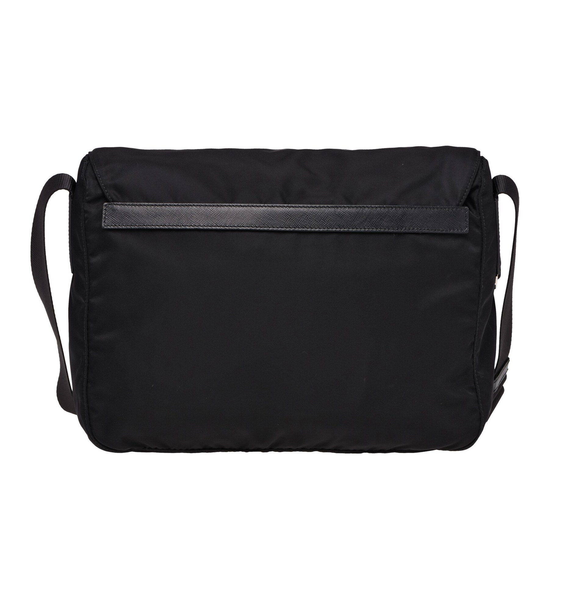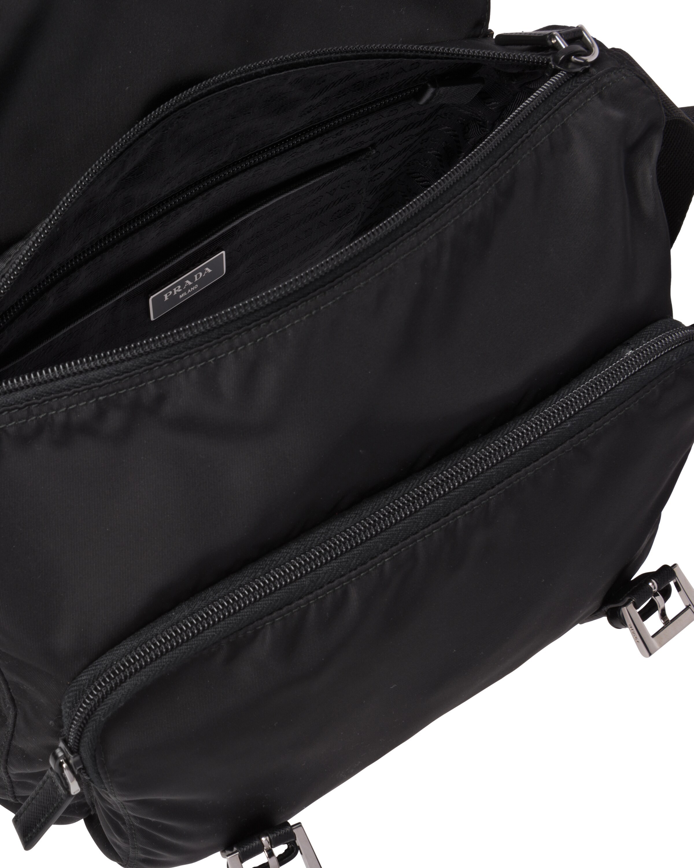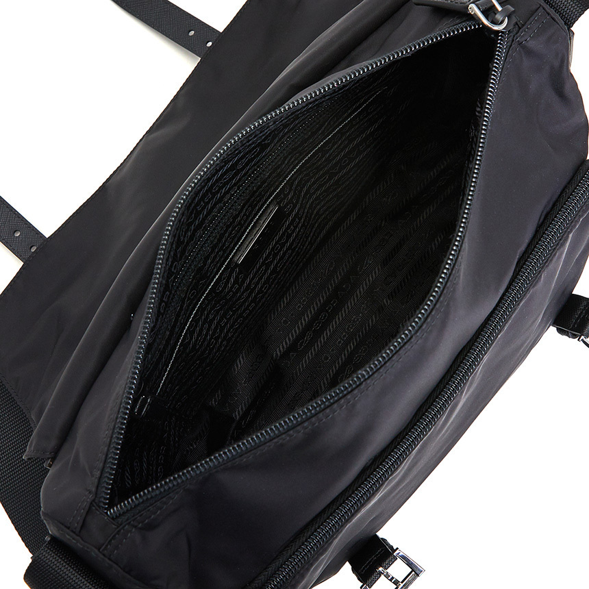 「サフィアーノ」レザー(牛革)のディテールで飾られた、ファブリックのメッセンジャーバッグ。プラダのロゴとスティール金具で飾られ、内側と外側に複数のポケットがあり、プラダのロゴ入りライニングがアクセントになっています。